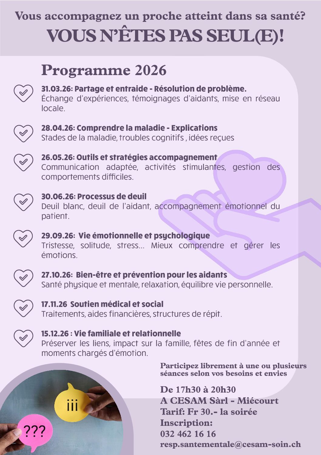 Afin d’accompagner concrètement les proches aidants dans leur quotidien, CESAM propose un programme de rencontres mensuelles dédiées à l’échange, au soutien et à la recherche de solutions.